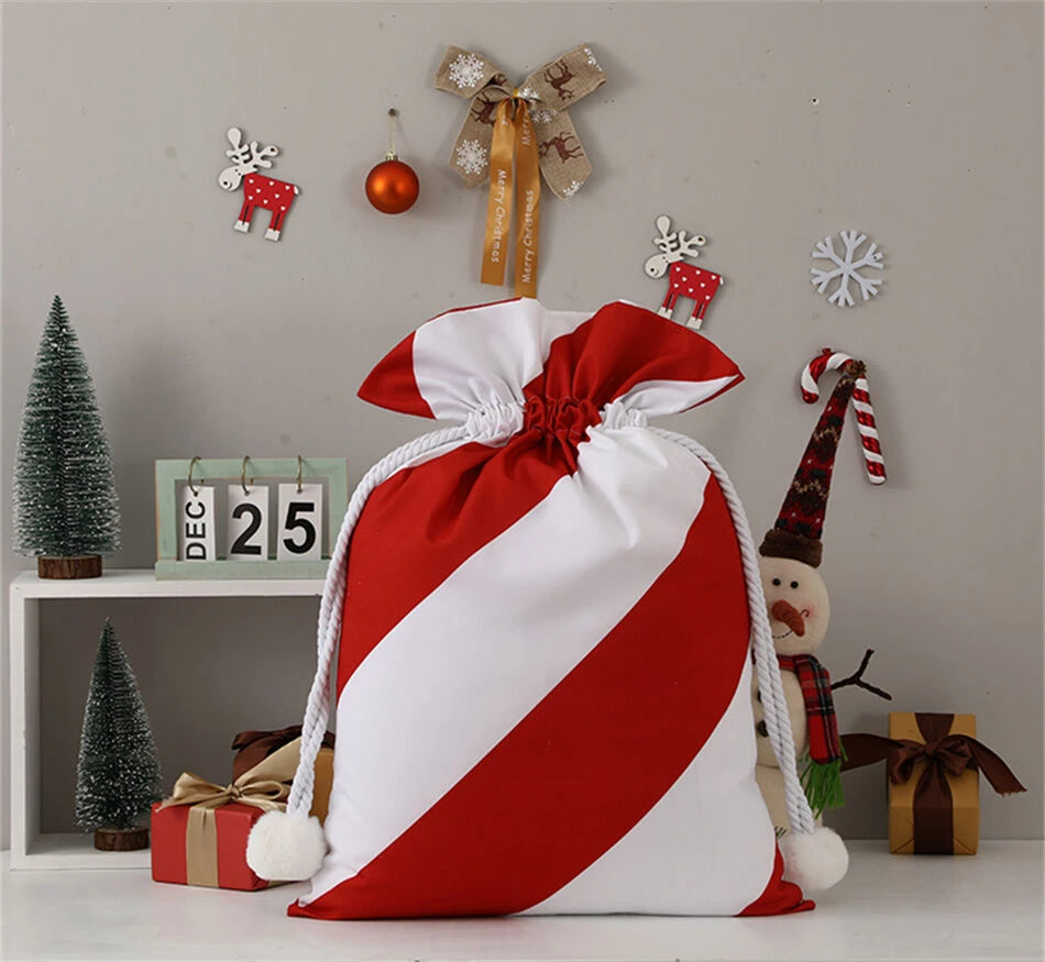 Wholesale Canvas Striped Santa Sacks Pom Pom Style Sublimation Christmas Sack Ba