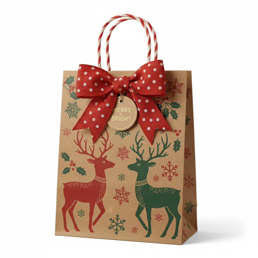 Reusable Kraft Paper Christmas Gift Bag With Ribbon Handle And Holiday Themed Pr